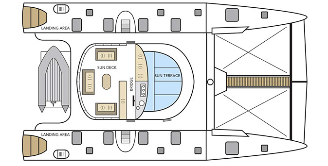 The Nemo I (also known as the Nemo Martinica) is a 14-passenger sailing catamaran, offering a unique cruising experience in the Galapagos Archipelago. The catamaran was designed and built in France by Dufour’s Sparks. On this catamaran you will experience the Galapagos Archipelago to its fullest. Most social areas are open deck spaces where you will constantly enjoy the most spectacular views of the islands and their volcanic rock formations. These areas include various lounges and catamaran netting at the front. Meals are served in the indoor and outdoor dining areas. When weather conditions permit we can turn off the engines and raise the sails, navigating silently through one the world’s natural wonders.